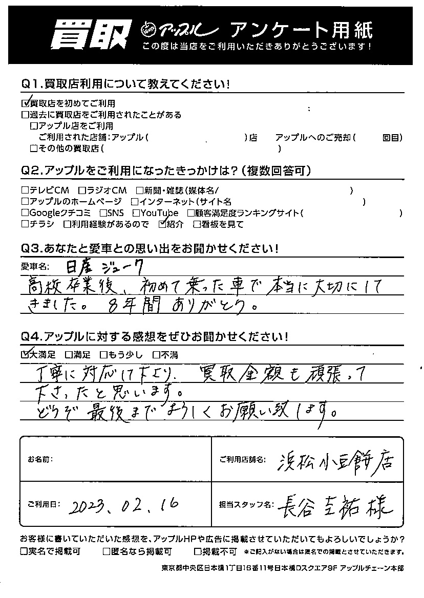 お車のご相談・ 査定だけでもOK! カンタン 入力 30秒 アップルがブランド買取始めました! お電話でも受付中! 受付時間10:00 ~ 18:30 053-437-7711 お車のご相談・ 査定だけでもOK! カンタン 入力 30秒 アップルがブランド買取始めました! お電話でも受付中! 受付時間10:00 ~ 18:30 053-437-7711 アップルがブランド買取始めました! お電話でも受付中! 受付時間10:00 ~ 18:30 053-437-7711 店舗情報 在庫車 スタッフ紹介 ブログ お客様の声 キャンペーン お得 無料査定 click お客様の声 ご記入日: 2023/02/16 M.I様 車名:日産 ジューク Q:あなたと愛車との思い出をお聞かせください! 高校卒業後、初めて乗った車で本当に大切にしてきました。 8年間ありがとう。Q:アップルに対する感想をぜひお聞かせください! 丁寧に対応して下さり、買取金額も頑張って 下さったと思います。 どうぞ最後までよろしくお願い致します。 前へ 次へ お客様の声一覧を見る