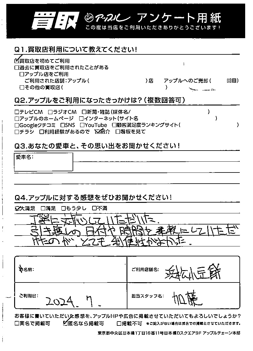 お車のご相談・ 査定だけでもOK! カンタン 入力 30秒 アップルがブランド買取始めました! お電話でも受付中! 受付時間10:00 ~ 18:30 053-437-7711 お車のご相談・ 査定だけでもOK! カンタン 入力 30秒 アップルがブランド買取始めました! お電話でも受付中! 受付時間10:00 ~ 18:30 053-437-7711 アップルがブランド買取始めました! お電話でも受付中! 受付時間10:00 ~ 18:30 053-437-7711 店舗情報 在庫車 スタッフ紹介 ブログ お客様の声 キャンペーン お得 無料査定 click お客様の声 ご記入日: 2024/06/15 T.T様 車名:マツダ デミオ Q:アップルに対する感想をぜひお聞かせください。 丁寧に対応していただいた。 引き渡しの日付や時間を柔軟にしていただけたのが とても利便性がよかった。 前へ 次へ お客様の声一覧を見る