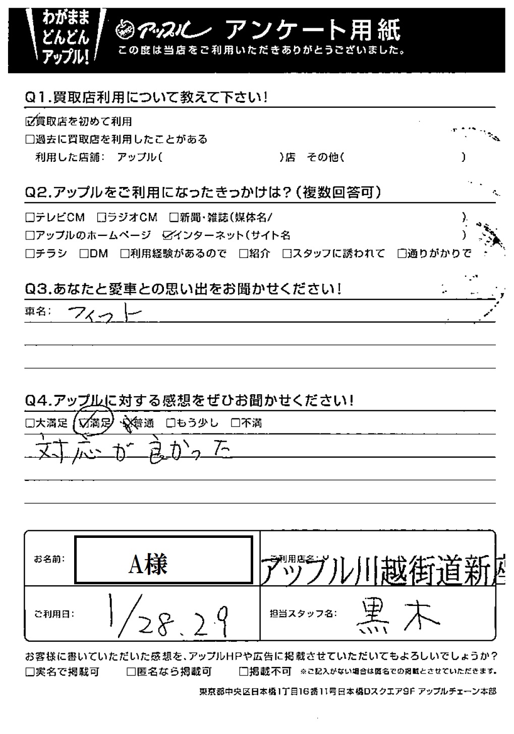 お車のご相談・ 査定だけでもOK! カンタン 入力 30秒 アップルがブランド買取始めました! お電話でも受付中! 受付時間10:00 ~ 19:00 048-478-9411 お車のご相談・ 査定だけでもOK! カンタン 入力 30秒 アップルがブランド買取始めました! お電話でも受付中! 受付時間10:00 ~ 19:00 048-478-9411 アップルがブランド買取始めました! お電話でも受付中! 受付時間10:00 ~ 19:00 048-478-9411 店舗情報 在庫車 スタッフ紹介 ブログ お客様の声 キャンペーン お得 無料査定 click お客様の声 ご記入日: 2021/01/29 A様 車名:ホンダ フィット(H25年9月以降のハイブリッド含む) Q アップルに対する感想をぜひお聞かせください!感想:満足対応が良かった 前へ 次へ お客様の声一覧を見る