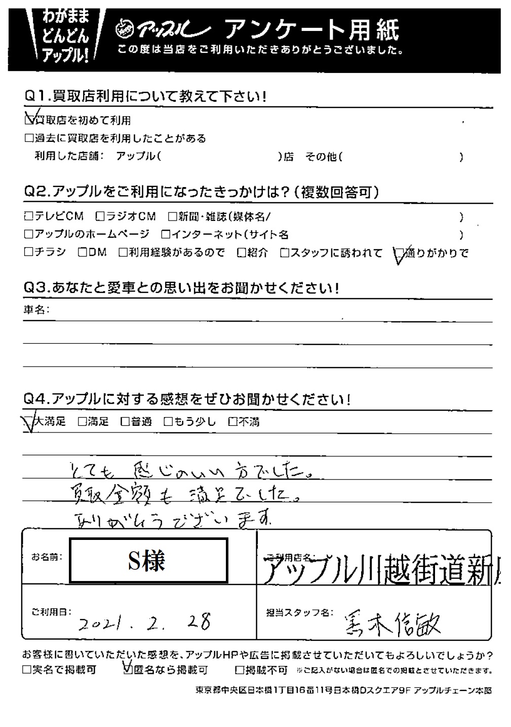 お車のご相談・ 査定だけでもOK! カンタン 入力 30秒 アップルがブランド買取始めました! お電話でも受付中! 受付時間10:00 ~ 19:00 048-478-9411 お車のご相談・ 査定だけでもOK! カンタン 入力 30秒 アップルがブランド買取始めました! お電話でも受付中! 受付時間10:00 ~ 19:00 048-478-9411 アップルがブランド買取始めました! お電話でも受付中! 受付時間10:00 ~ 19:00 048-478-9411 店舗情報 在庫車 スタッフ紹介 ブログ お客様の声 キャンペーン お得 無料査定 click お客様の声 ご記入日: 2021/02/28 S様 Q アップルに対する感想をぜひお聞かせください!感想:大満足とても感じのいい方でした。買取金額も満足でした。ありがとうございました。 前へ 次へ お客様の声一覧を見る