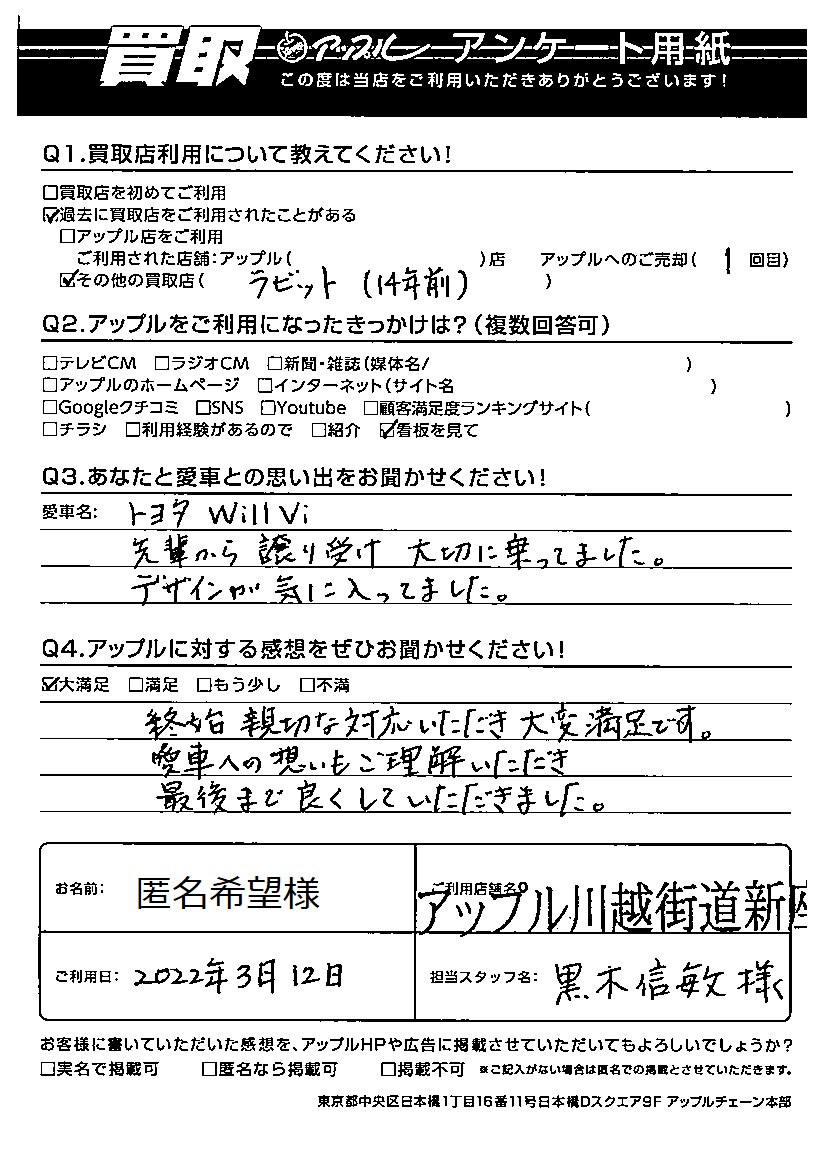 愛車:トヨタ Will Vi アップルへのご売却1回目 担当:黒木