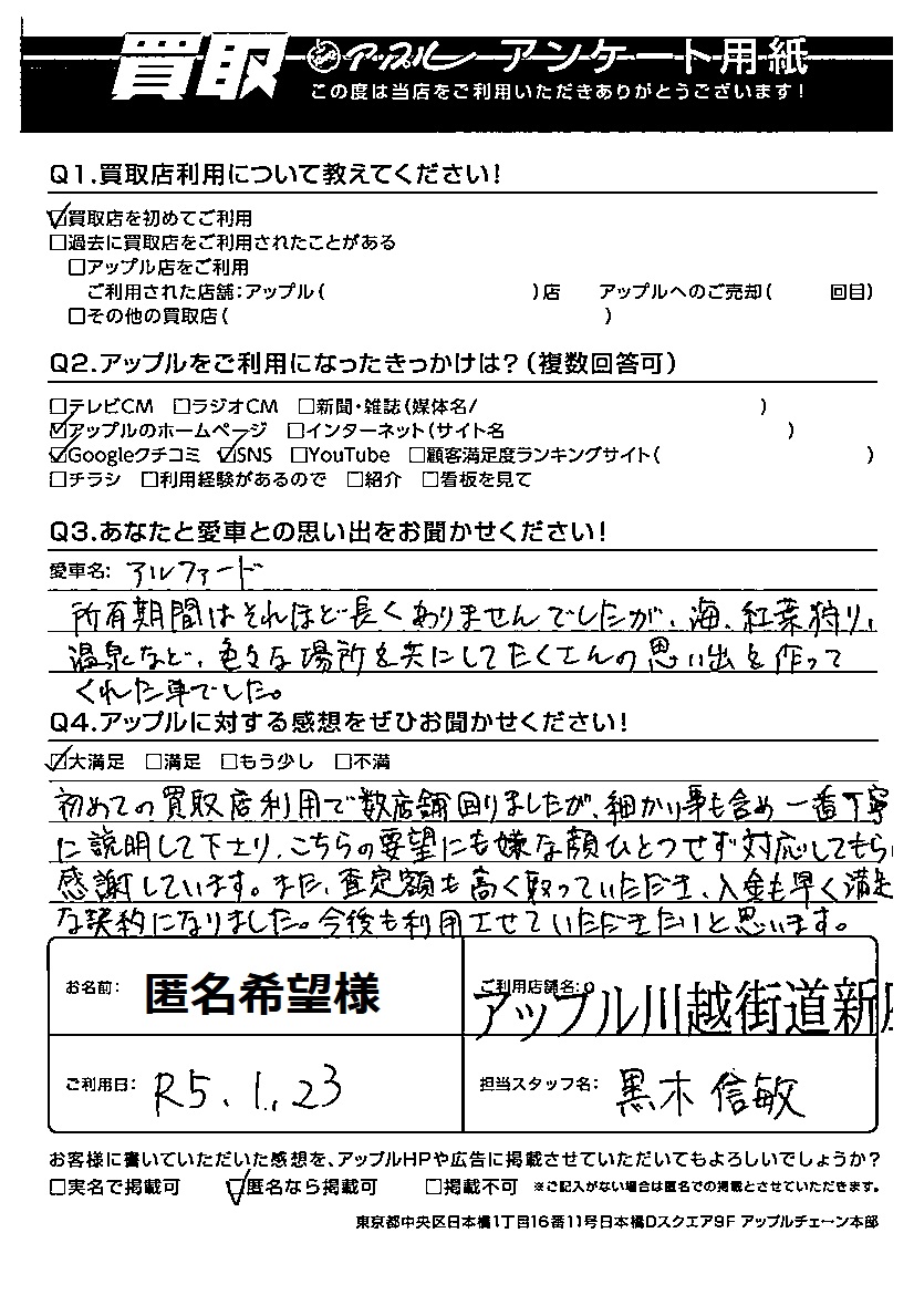 また査定額も高く取っていただき、入金も早く満足な契約になりました。