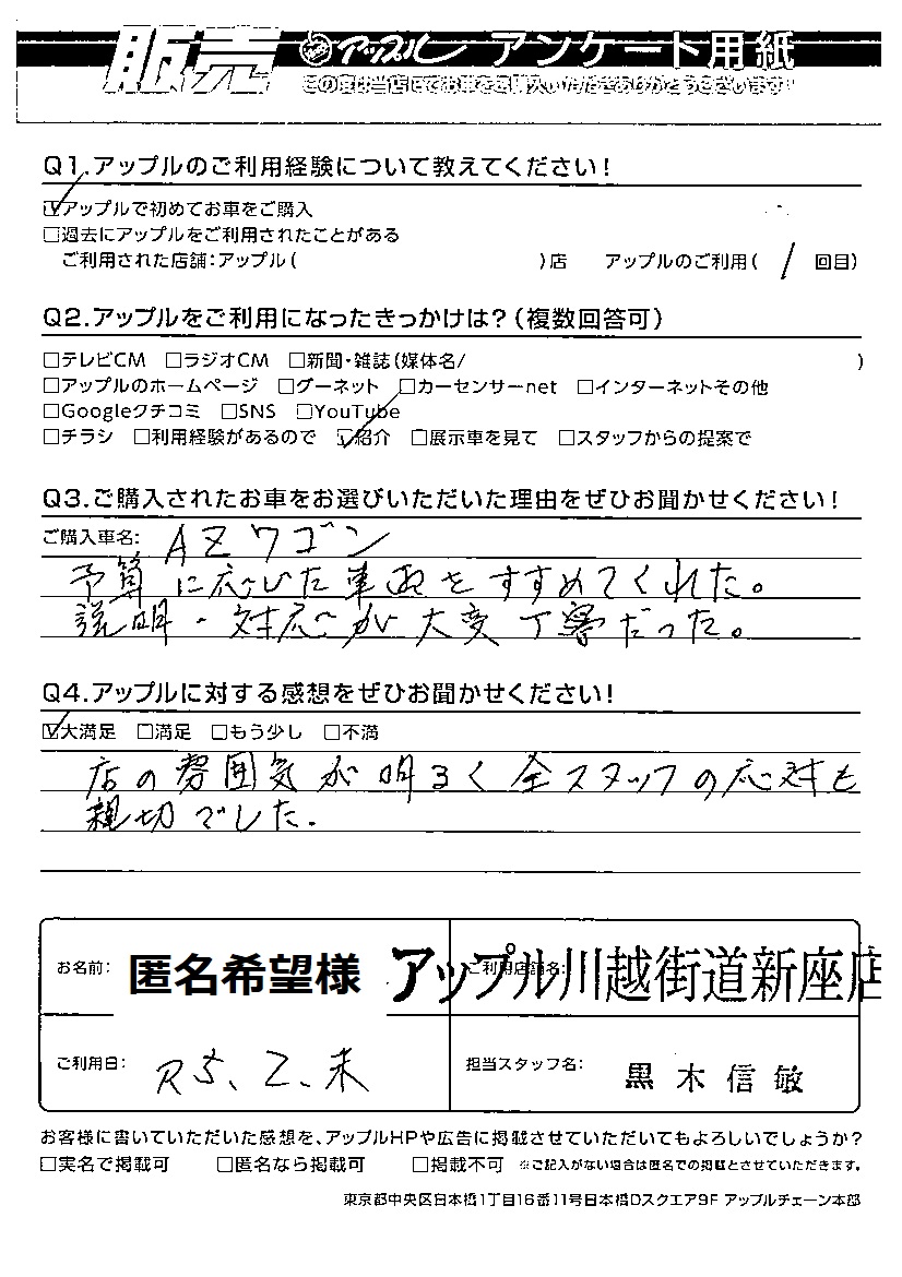 匿名希望 様 ご購入車:AZワゴン 担当:黒木