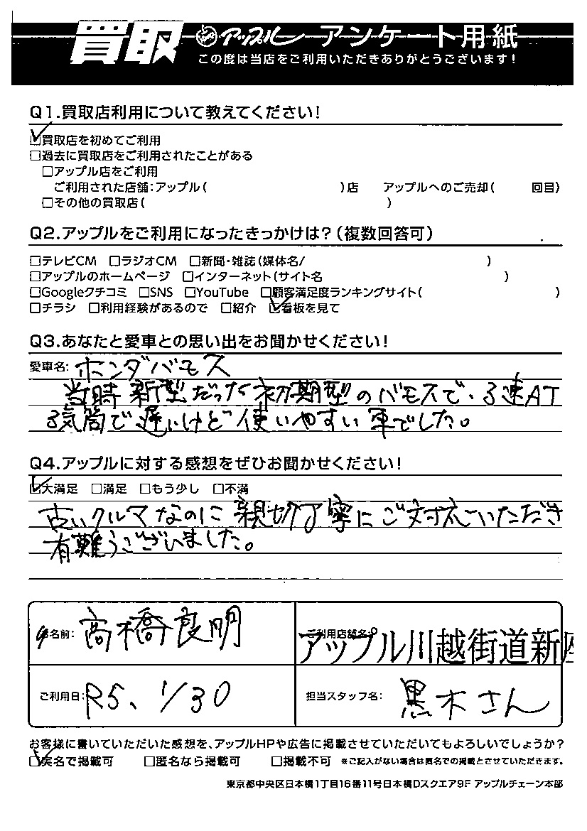 古いクルマなのに親切丁寧にご対応いただき有難うございました。