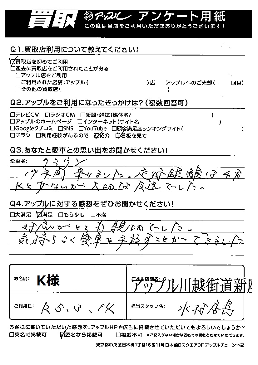 17年間乗りました。走行距離は4万Kと少ないが大切な友達でした。