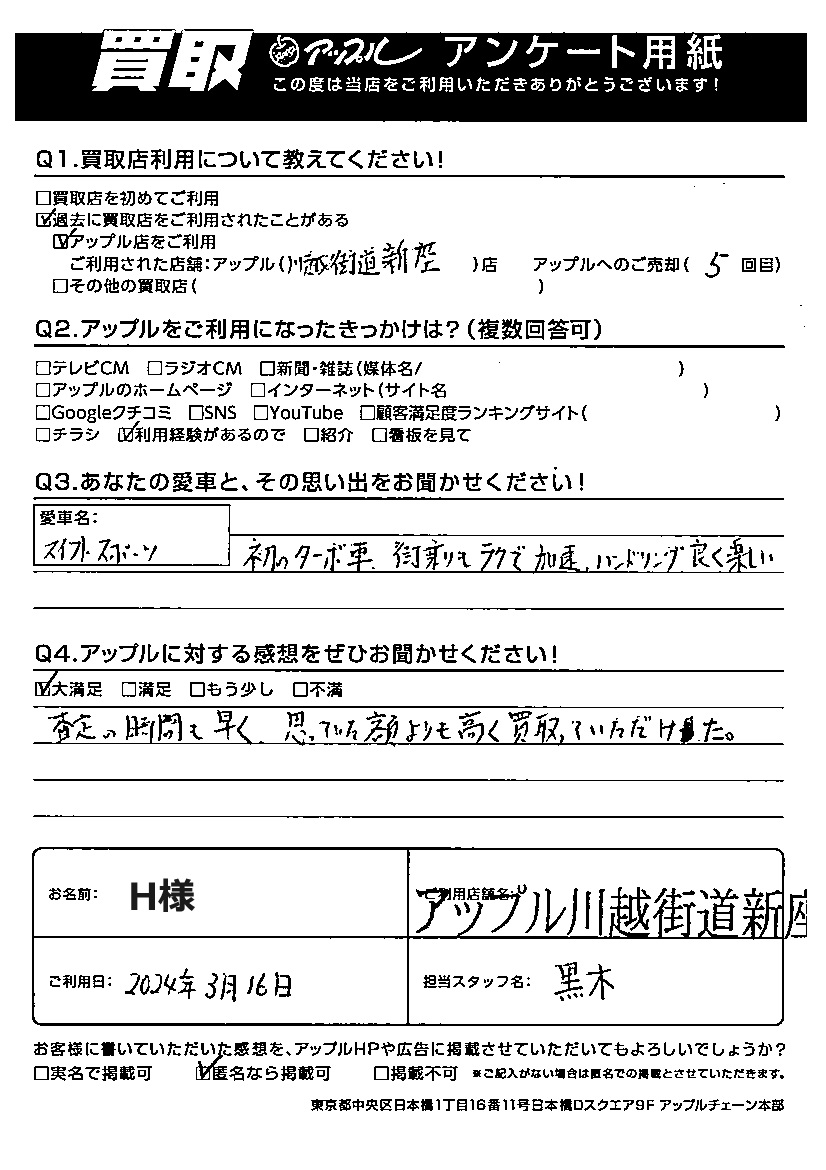 H様 車名:スズキ スイフト