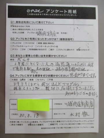 アップルの感想:ドキドキしながら飛び込んだアップル。担当スタッフが親切に応対して下さいました。有難うございました。