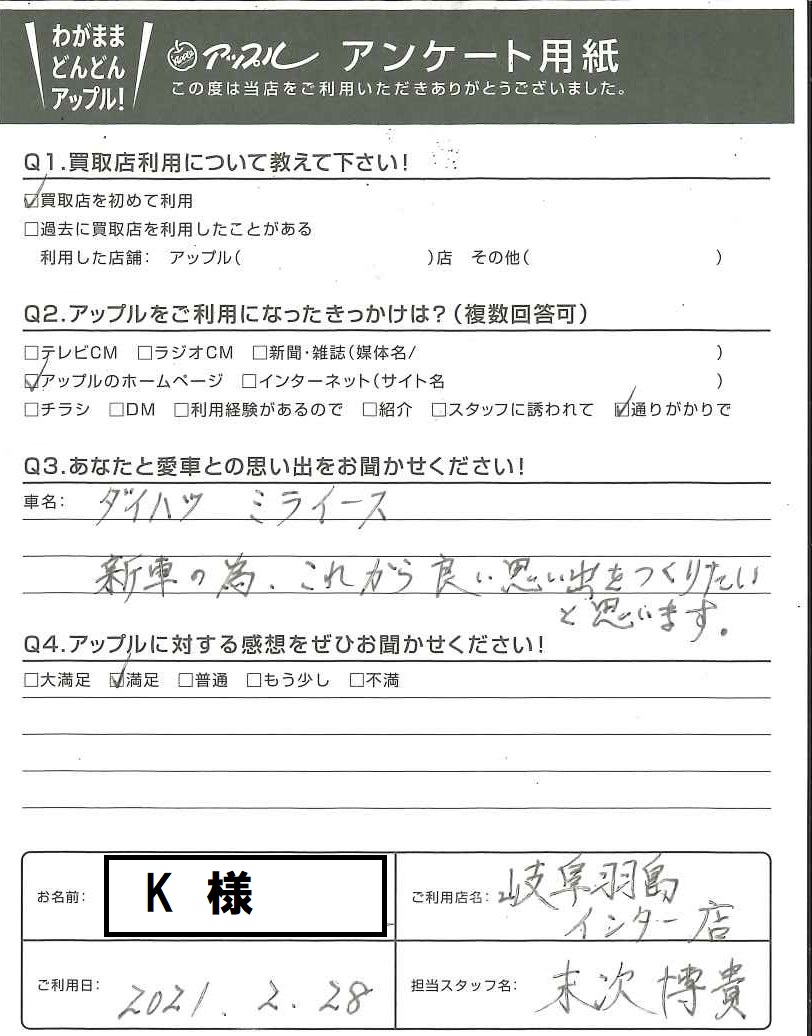 お車のご相談・ 査定だけでもOK! カンタン 入力 30秒 アップルがブランド買取始めました! お電話でも受付中! 受付時間10:00 ~ 19:00 058-398-4169 お車のご相談・ 査定だけでもOK! カンタン 入力 30秒 アップルがブランド買取始めました! お電話でも受付中! 受付時間10:00 ~ 19:00 058-398-4169 アップルがブランド買取始めました! お電話でも受付中! 受付時間10:00 ~ 19:00 058-398-4169 店舗情報 在庫車 スタッフ紹介 ブログ お客様の声 キャンペーン お得 無料査定 click お客様の声 ご記入日: 2021/02/28 K様 車名:ダイハツ ミライース Q、あなたと愛車との思い出をお聞かせください! 新車の為、これから良い思い出をつくりたいと思います。Q、アップルに対する感想をぜひお聞かせください! 満足 前へ 次へ お客様の声一覧を見る