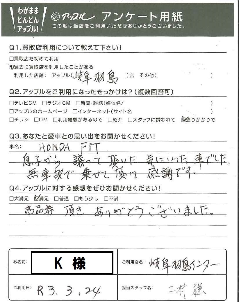 お車のご相談・ 査定だけでもOK! カンタン 入力 30秒 アップルがブランド買取始めました! お電話でも受付中! 受付時間10:00 ~ 19:00 058-398-4169 お車のご相談・ 査定だけでもOK! カンタン 入力 30秒 アップルがブランド買取始めました! お電話でも受付中! 受付時間10:00 ~ 19:00 058-398-4169 アップルがブランド買取始めました! お電話でも受付中! 受付時間10:00 ~ 19:00 058-398-4169 店舗情報 在庫車 スタッフ紹介 ブログ お客様の声 キャンペーン お得 無料査定 click お客様の声 ご記入日: 2021/03/24 K様 車名:ホンダ フィット(H25年9月以降のハイブリッド含む) Q、あなたと愛車との思い出をお聞かせください! 息子から譲って頂いた気にいった車でした。 無事故で乗せて頂いて感謝です。Q、アップルに対する感想をぜひお聞かせください! 満足 商品券頂きありがとうございました。 前へ 次へ お客様の声一覧を見る