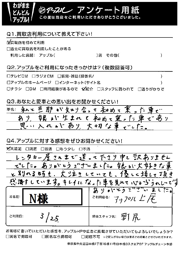 レンタカー屋さんまで送って下さり申し訳ありませんでした。ありがとうございました。娘が大好きな車と別れる時も、大泣きしていても、優しく接して頂き感謝しています。キレイになった車を見れて心からうれしいです。ありがとうございました。