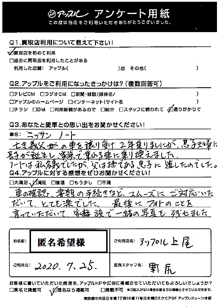 車の確認、書類の手続きなどスムーズにご対応いただいてとても楽でした。