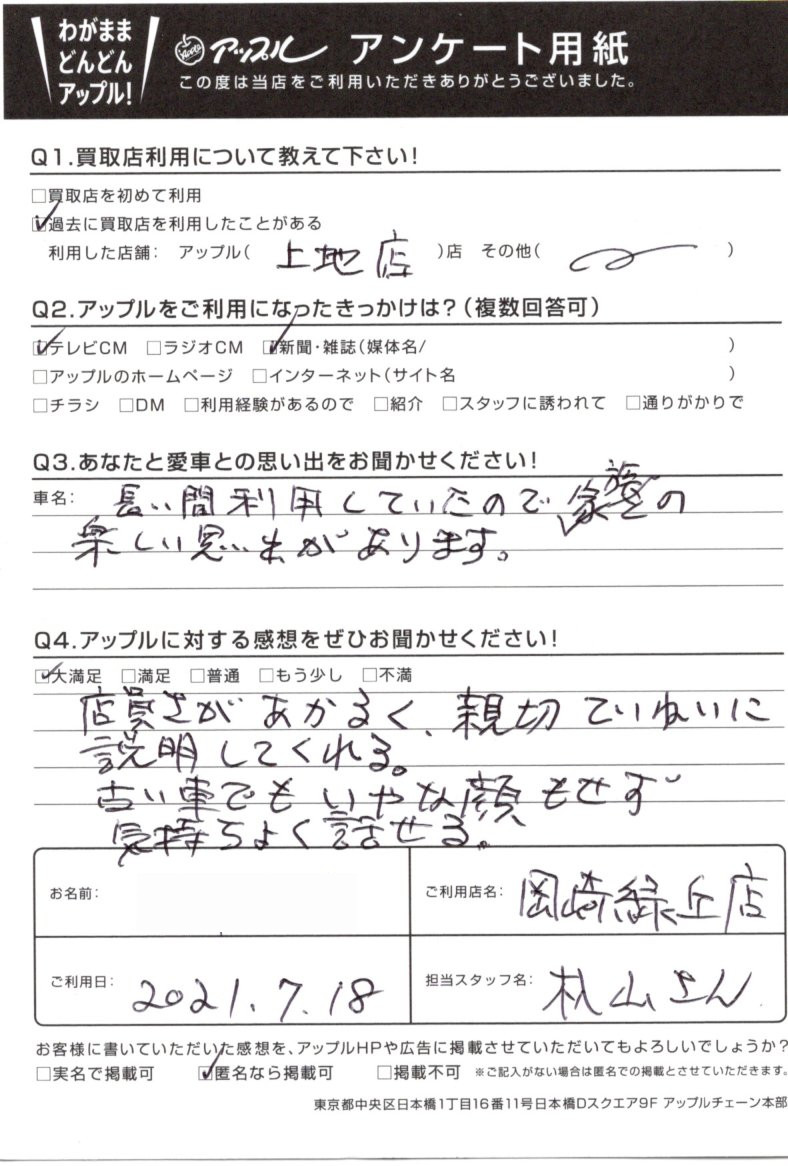 お車のご相談・ 査定だけでもOK! カンタン 入力 30秒 アップルがブランド買取始めました! お電話でも受付中! 受付時間10:00 ~ 19:00 0564-57-0123 お車のご相談・ 査定だけでもOK! カンタン 入力 30秒 アップルがブランド買取始めました! お電話でも受付中! 受付時間10:00 ~ 19:00 0564-57-0123 アップルがブランド買取始めました! お電話でも受付中! 受付時間10:00 ~ 19:00 0564-57-0123 店舗情報 在庫車 スタッフ紹介 ブログ お客様の声 キャンペーン 無料査定 click お客様の声 ご記入日: 2021/07/18 愛知県 匿名希望様 店員さんがあかるく、新設ていねいに説明してくれる。古い車でもいやな顔をせず気持ちよく話せる。 前へ 次へ お客様の声一覧を見る