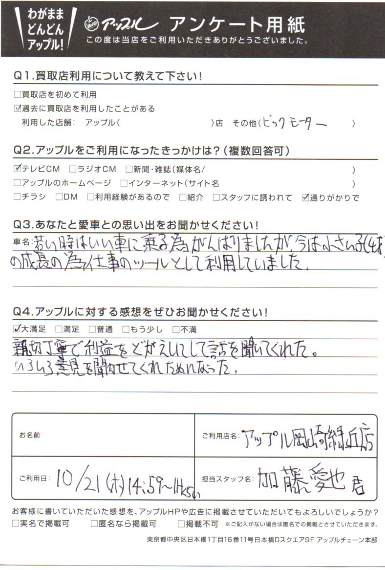 お車のご相談・ 査定だけでもOK! カンタン 入力 30秒 アップルがブランド買取始めました! お電話でも受付中! 受付時間10:00 ~ 19:00 0564-57-0123 お車のご相談・ 査定だけでもOK! カンタン 入力 30秒 アップルがブランド買取始めました! お電話でも受付中! 受付時間10:00 ~ 19:00 0564-57-0123 アップルがブランド買取始めました! お電話でも受付中! 受付時間10:00 ~ 19:00 0564-57-0123 店舗情報 在庫車 スタッフ紹介 ブログ お客様の声 キャンペーン 無料査定 click お客様の声 ご記入日: 2021/10/21 愛知県 匿名希望様 親切丁寧で利益をどがえしにして話を聞いてくれた。いろいろ意見を聞かせてくれためになった。 前へ 次へ お客様の声一覧を見る
