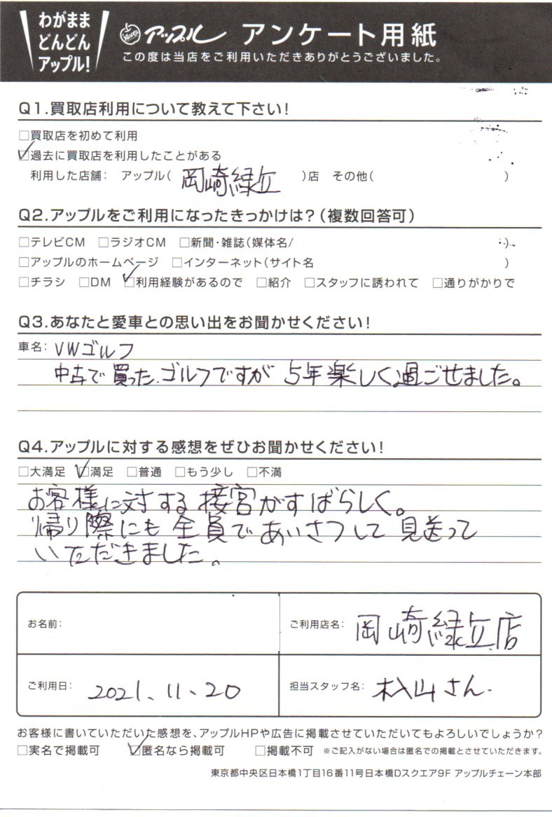 お車のご相談・ 査定だけでもOK! カンタン 入力 30秒 アップルがブランド買取始めました! お電話でも受付中! 受付時間10:00 ~ 19:00 0564-57-0123 お車のご相談・ 査定だけでもOK! カンタン 入力 30秒 アップルがブランド買取始めました! お電話でも受付中! 受付時間10:00 ~ 19:00 0564-57-0123 アップルがブランド買取始めました! お電話でも受付中! 受付時間10:00 ~ 19:00 0564-57-0123 店舗情報 在庫車 スタッフ紹介 ブログ お客様の声 キャンペーン 無料査定 click お客様の声 ご記入日: 2021/11/20 愛知県 匿名希望様 車名:フォルクスワーゲン ゴルフ お客様に対する接客が素晴らしく、帰り際にも全員であいさつして見送っていただきました。 前へ 次へ お客様の声一覧を見る