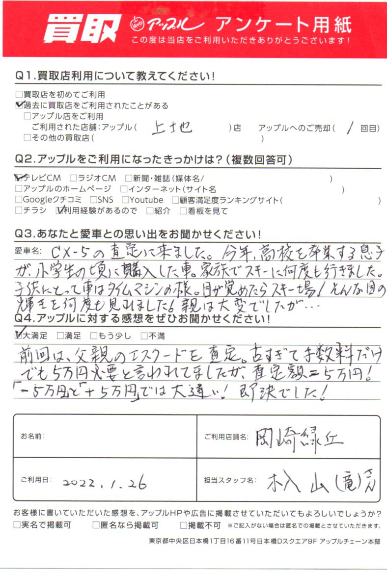 お車のご相談・ 査定だけでもOK! カンタン 入力 30秒 アップルがブランド買取始めました! お電話でも受付中! 受付時間10:00 ~ 19:00 0564-57-0123 お車のご相談・ 査定だけでもOK! カンタン 入力 30秒 アップルがブランド買取始めました! お電話でも受付中! 受付時間10:00 ~ 19:00 0564-57-0123 アップルがブランド買取始めました! お電話でも受付中! 受付時間10:00 ~ 19:00 0564-57-0123 店舗情報 在庫車 スタッフ紹介 ブログ お客様の声 キャンペーン 無料査定 click お客様の声 ご記入日: 2022/01/26 愛知県 匿名希望様 車名:マツダ CX-5 前回は、父親のエスクードを査定。古すぎて手数料だけでも5万円必要と言われてましたが、査定額=5万円!「-5万円」と「+5万円」では大違い!即決でした!。 前へ 次へ お客様の声一覧を見る