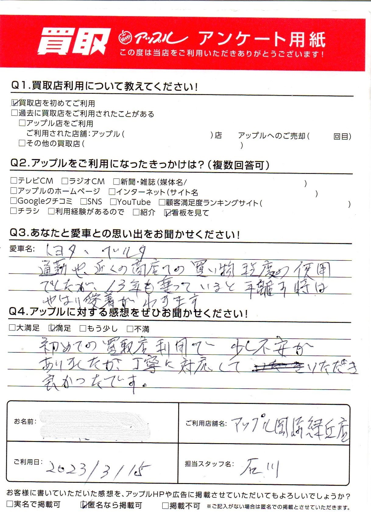 お車のご相談・ 査定だけでもOK! カンタン 入力 30秒 アップルがブランド買取始めました! お電話でも受付中! 受付時間10:00 ~ 19:00 0564-57-0123 お車のご相談・ 査定だけでもOK! カンタン 入力 30秒 アップルがブランド買取始めました! お電話でも受付中! 受付時間10:00 ~ 19:00 0564-57-0123 アップルがブランド買取始めました! お電話でも受付中! 受付時間10:00 ~ 19:00 0564-57-0123 店舗情報 在庫車 スタッフ紹介 ブログ お客様の声 キャンペーン 無料査定 click お客様の声 ご記入日: 2023/03/15 匿名希望様 車名:トヨタ ベルタ 初めての買取店利用で少し不安がありましたが、丁寧に対応していただき良かったです。 前へ 次へ お客様の声一覧を見る