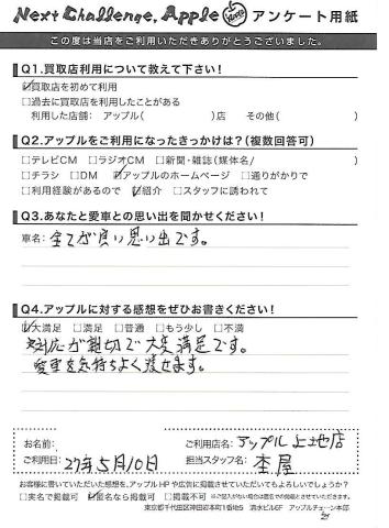 お車のご相談・ 査定だけでもOK! カンタン 入力 30秒 アップルがブランド買取始めました! お電話でも受付中! 受付時間10:00 ~ 19:00 0564-57-0123 お車のご相談・ 査定だけでもOK! カンタン 入力 30秒 アップルがブランド買取始めました! お電話でも受付中! 受付時間10:00 ~ 19:00 0564-57-0123 アップルがブランド買取始めました! お電話でも受付中! 受付時間10:00 ~ 19:00 0564-57-0123 店舗情報 在庫車 スタッフ紹介 ブログ お客様の声 キャンペーン 無料査定 click お客様の声 ご記入日: 2015/05/10 匿名希望様 ★あなたと愛車との思い出を聞かせて下さい!全てが良い思い出です!!★アップルに対する感想!大満足!対応が親切で大変満足です!愛車を気持ちよく渡せます!! 前へ 次へ お客様の声一覧を見る