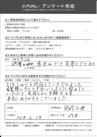 Q2.アップルに対する感想をお聞かせ下さい!・・・とてもしっかりと対応していただきました。希望額に少しでも近づくように努力していただき、気持ちよく手離せます。本当にありがとうございました。