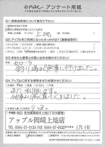 お車のご相談・ 査定だけでもOK! カンタン 入力 30秒 アップルがブランド買取始めました! お電話でも受付中! 受付時間10:00 ~ 19:00 0564-57-0123 お車のご相談・ 査定だけでもOK! カンタン 入力 30秒 アップルがブランド買取始めました! お電話でも受付中! 受付時間10:00 ~ 19:00 0564-57-0123 アップルがブランド買取始めました! お電話でも受付中! 受付時間10:00 ~ 19:00 0564-57-0123 店舗情報 在庫車 スタッフ紹介 ブログ お客様の声 キャンペーン 無料査定 click お客様の声 ご記入日: 2016/09/03 岡崎市 T様 Q1.愛車との思い出をお聞かせください!・・・釣り場まで無事に行けました。Q2.アップルに対する感想をお聞かせください!・・・また利用します。他社より高く買ってくれました。担当スタッフ:佐伯 前へ 次へ お客様の声一覧を見る
