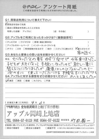 Q1.愛車との思い出をお聞かせください!・・・亡くなった父の車をゆずり受けて4年乗りました。子どもが大きくなって手狭になったので新しい車に替えることになりましたが廃車はしのびなかったので次の方に使っていただける機会をいただけてホッとしました。