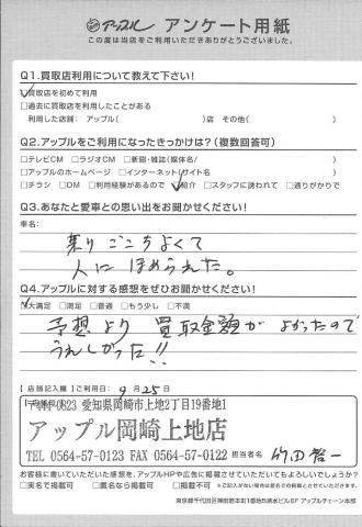 お車のご相談・ 査定だけでもOK! カンタン 入力 30秒 アップルがブランド買取始めました! お電話でも受付中! 受付時間10:00 ~ 19:00 0564-57-0123 お車のご相談・ 査定だけでもOK! カンタン 入力 30秒 アップルがブランド買取始めました! お電話でも受付中! 受付時間10:00 ~ 19:00 0564-57-0123 アップルがブランド買取始めました! お電話でも受付中! 受付時間10:00 ~ 19:00 0564-57-0123 店舗情報 在庫車 スタッフ紹介 ブログ お客様の声 キャンペーン 無料査定 click お客様の声 ご記入日: 2016/09/25 岡崎市 K様 Q1.愛車との思い出をお聞かせください!・・・座りごこちよくて人にほめられた。Q2.アップルに対する感想をお聞かせください!・・・予想より買取金額がよかったのでうれしかった!!担当スタッフ:竹田 前へ 次へ お客様の声一覧を見る