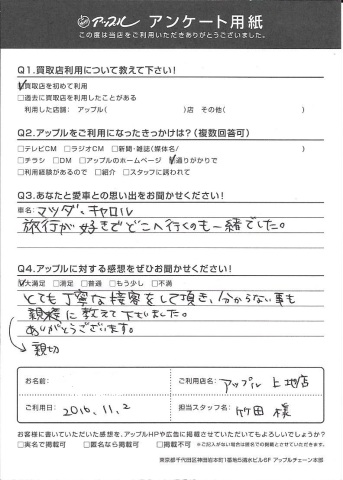 Q2.アップルに対する感想をお聞かせください!・・・とても丁寧な接客をして頂き、分からない事も親切に教えて下さいました。ありがとうございます。