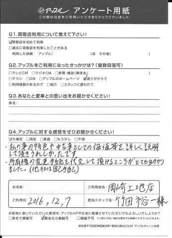 Q1.アップルに対する感想をお聞かせください!・・・私の車の特色や中古車としての価値等を詳しく説明して頂きうれしかったです。所有権の変更手続きを代行して頂けるところがとても助かりました(他社は自己手配)