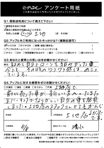 Q2.アップルに対する感想をお聞かせください!・・・前に売った車が新しい方へ。たまたまパーキングでなつかしい自分の車を発見しました。上地店のスタッフさんとてもかんじよかったです。