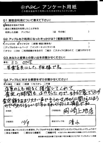 Q2.アップルに対する感想をお聞かせください!・・・店員の人も明るく接客してくれて査定の時間もはやかったの、好印象でしたが査定額をあまり大きい声で言うのは他の人に聞こえてしまうのでやめてほしいです。それ以外は満点です。