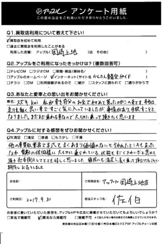 Q2.アップルに対する感想をお聞かせください!・・・他の車買取業者で年式も古くあまり価値のないと言われたところもあったなか、貴社の佐伯様に大切に乗られている、状態もすごくきれいだと褒めて頂き売手側としてとても嬉しく思いました。値段にも満足し、長く乗って頂けることに期待しお売りしました。