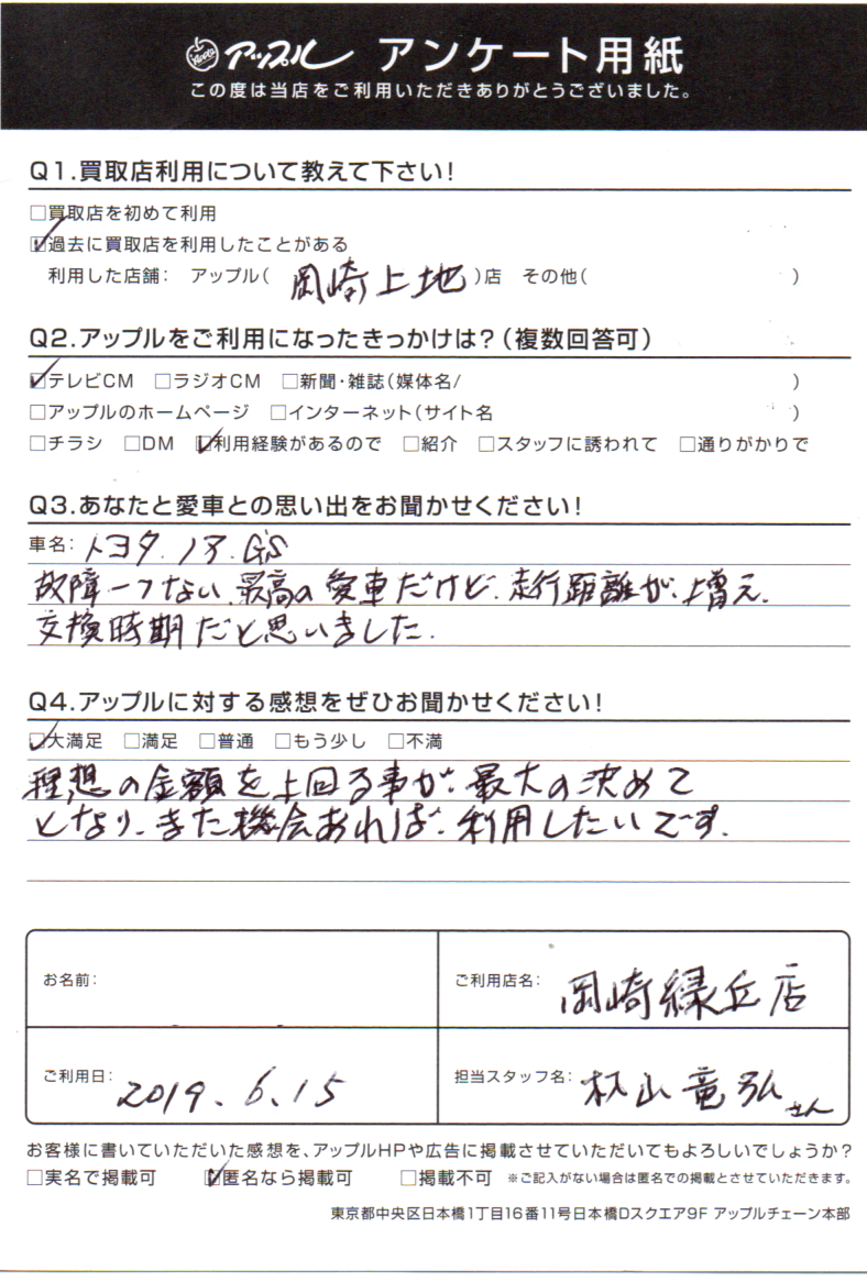 お車のご相談・ 査定だけでもOK! カンタン 入力 30秒 アップルがブランド買取始めました! お電話でも受付中! 受付時間10:00 ~ 19:00 0564-57-0123 お車のご相談・ 査定だけでもOK! カンタン 入力 30秒 アップルがブランド買取始めました! お電話でも受付中! 受付時間10:00 ~ 19:00 0564-57-0123 アップルがブランド買取始めました! お電話でも受付中! 受付時間10:00 ~ 19:00 0564-57-0123 店舗情報 在庫車 スタッフ紹介 ブログ お客様の声 キャンペーン 無料査定 click お客様の声 ご記入日: 2019/06/15 匿名希望様 車名:トヨタ ノア 理想の金額を上回ることが最大の決め手となり、また機会あれば利用したいです。 前へ 次へ お客様の声一覧を見る