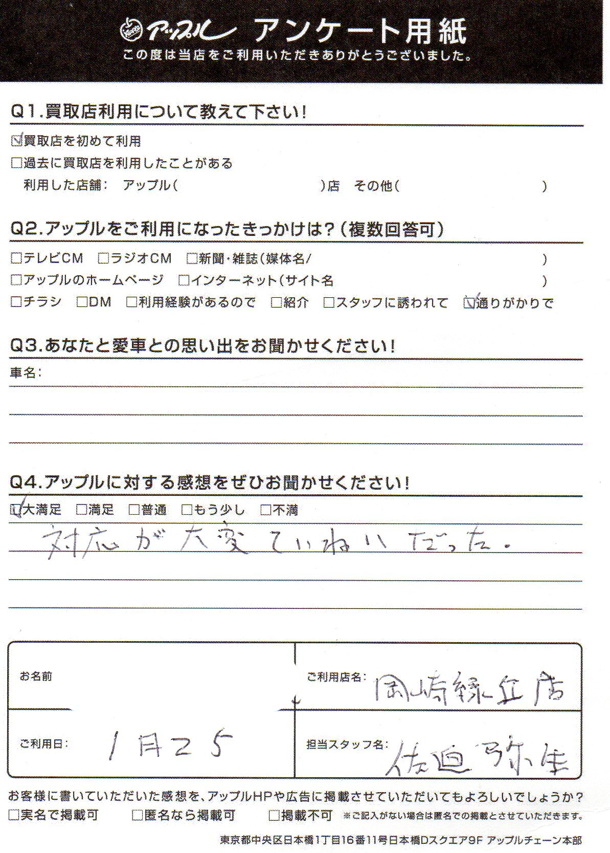 お車のご相談・ 査定だけでもOK! カンタン 入力 30秒 アップルがブランド買取始めました! お電話でも受付中! 受付時間10:00 ~ 19:00 0564-57-0123 お車のご相談・ 査定だけでもOK! カンタン 入力 30秒 アップルがブランド買取始めました! お電話でも受付中! 受付時間10:00 ~ 19:00 0564-57-0123 アップルがブランド買取始めました! お電話でも受付中! 受付時間10:00 ~ 19:00 0564-57-0123 店舗情報 在庫車 スタッフ紹介 ブログ お客様の声 キャンペーン 無料査定 click お客様の声 ご記入日: 2020/01/25 愛知県 匿名希望様 対応が大変ていねいだった。 前へ 次へ お客様の声一覧を見る
