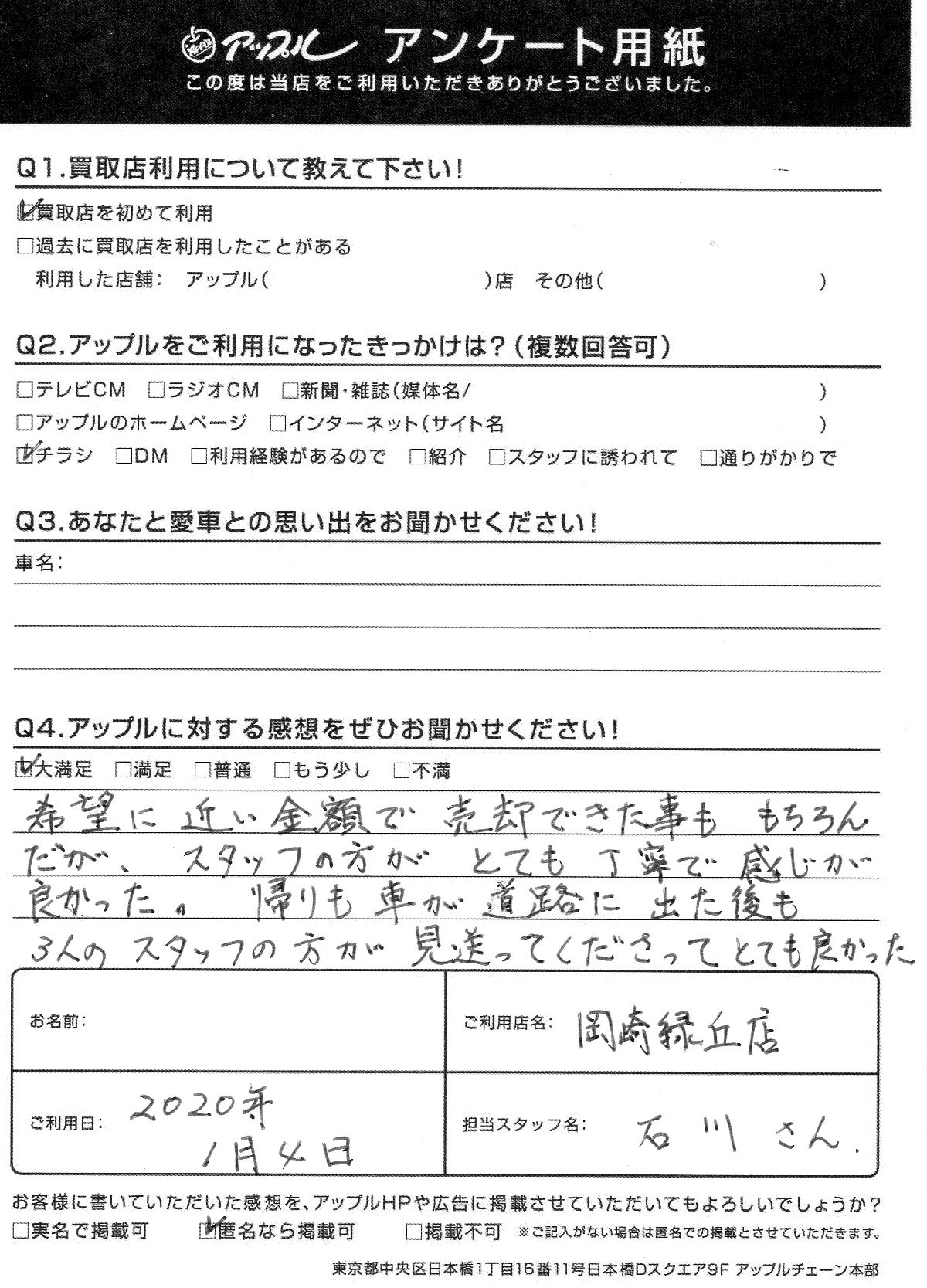お車のご相談・ 査定だけでもOK! カンタン 入力 30秒 アップルがブランド買取始めました! お電話でも受付中! 受付時間10:00 ~ 19:00 0564-57-0123 お車のご相談・ 査定だけでもOK! カンタン 入力 30秒 アップルがブランド買取始めました! お電話でも受付中! 受付時間10:00 ~ 19:00 0564-57-0123 アップルがブランド買取始めました! お電話でも受付中! 受付時間10:00 ~ 19:00 0564-57-0123 店舗情報 在庫車 スタッフ紹介 ブログ お客様の声 キャンペーン 無料査定 click お客様の声 ご記入日: 2020/01/04 愛知県 匿名希望様 希望に近い金額で売却できた事ももちろんだが、スタッフの方がとても丁寧で感じが良かった。帰りも車が道路に出た後も3人のスタッフの方が見送ってくださってとても良かった。 前へ 次へ お客様の声一覧を見る