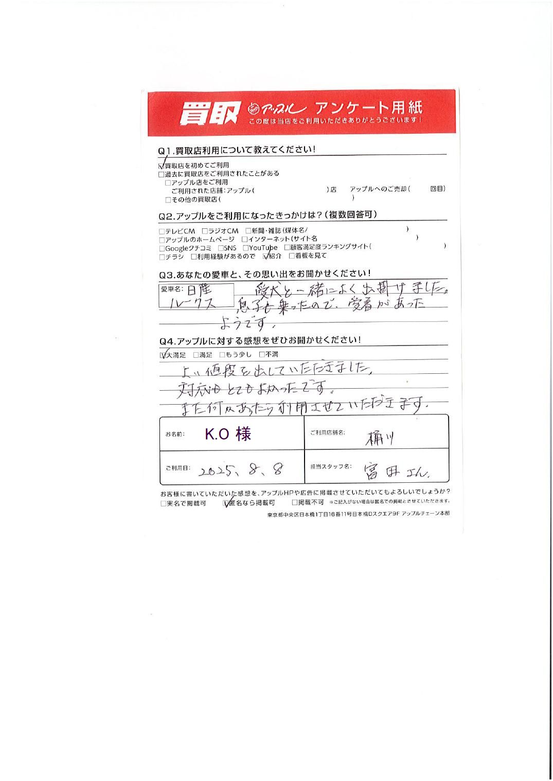 お車のご相談・ 査定だけでもOK! カンタン 入力 30秒 アップルがブランド買取始めました! お電話でも受付中! 受付時間9:30 ~ 19:00 048-783-2474 お車のご相談・ 査定だけでもOK! カンタン 入力 30秒 アップルがブランド買取始めました! お電話でも受付中! 受付時間9:30 ~ 19:00 048-783-2474 アップルがブランド買取始めました! お電話でも受付中! 受付時間9:30 ~ 19:00 048-783-2474 店舗情報 在庫車 スタッフ紹介 ブログ お客様の声 キャンペーン お得 無料査定 click お客様の声 ご記入日: 2025/08/08 埼玉県桶川市 K・O様 車名:日産 ルークス ・あなたの愛車との思い出愛犬と一緒によく出掛けました。息子も乗ったので、愛着があったようです、・アップルに対する感想よい値段を出していただきました。対応とてもよかったです。また何かあったら利用させていただきます。 前へ 次へ お客様の声一覧を見る