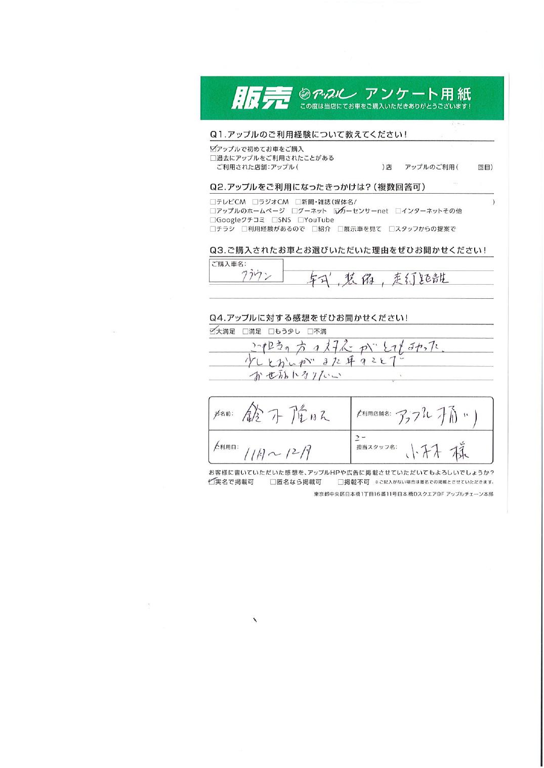 お車のご相談・ 査定だけでもOK! カンタン 入力 30秒 アップルがブランド買取始めました! お電話でも受付中! 受付時間9:30 ~ 19:00 048-783-2474 お車のご相談・ 査定だけでもOK! カンタン 入力 30秒 アップルがブランド買取始めました! お電話でも受付中! 受付時間9:30 ~ 19:00 048-783-2474 アップルがブランド買取始めました! お電話でも受付中! 受付時間9:30 ~ 19:00 048-783-2474 店舗情報 在庫車 スタッフ紹介 ブログ お客様の声 キャンペーン 無料査定 click お客様の声 ご記入日: 2025/11/23 埼玉県さいたま市 鈴木 隆昭様 車名:トヨタ クラウンセダン ・あなたの愛車との思い出年式、装備、走行距離・アップルに対する感想ご担当の方の対応がとてもよかった、少しとおいがまた車のことでお世話になりたい。 前へ 次へ お客様の声一覧を見る