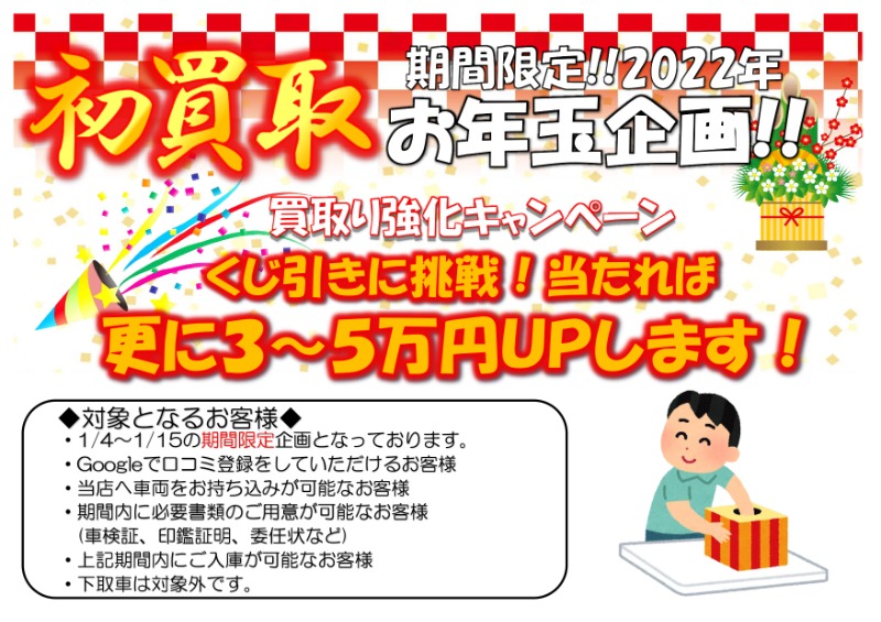 お車のご相談・ 査定だけでもOK! カンタン 入力 30秒 アップルがブランド買取始めました! お電話でも受付中! 受付時間09:30~18:30 011-676-4501 お車のご相談・ 査定だけでもOK! カンタン 入力 30秒 アップルがブランド買取始めました! お電話でも受付中! 受付時間09:30~18:30 011-676-4501 アップルがブランド買取始めました! お電話でも受付中! 受付時間09:30~18:30 011-676-4501 店舗情報 在庫車 スタッフ紹介 ブログ お客様の声 キャンペーン 無料査定 click [ つぶやき ] 2022/01/04 (火) 19:29 初買取!キャンペーン!やります! みなさーん!あけましておめでとうございます!昨年は本当にありがとうございました( *´艸`)今年もまた1年どうぞよろしくお願い申し上げます!2022年!!初売りならぬ初買取キャンペーンを開催いたします!今日から15日までの限定企画です!買取価格が3~5万円UPするチャンスです!とってもお得です( *´艸`)いくつかお約束もありますので対象となるお客様をご覧ください☆どしどしご来店お待ちしております( *´艸`)♪ 2022-01-04 19:29:30 新しい記事へ 古い記事へ 最新記事 ☆祝ご納車☆ジムニーシエラご納車!!ノートご納車!☆ご納車☆在庫車紹介! 店舗情報に戻る 月別アーカイブ 2026年04月(19)2026年03月(24)2026年02月(20)2026年01月(20)2025年12月(22)2025年11月(22)2025年10月(21)2025年09月(23)2025年08月(23)2025年07月(30)2025年06月(23)2025年05月(25)2025年04月(8)2025年03月(16)2025年02月(12)2025年01月(22)2024年12月(21)2024年11月(19)2024年10月(25)2024年09月(24)2024年08月(22)2024年07月(24)2024年06月(24)2024年05月(22)2024年04月(23)2024年03月(25)2024年02月(24)2024年01月(23)2023年12月(22)2023年11月(24)2023年10月(24)2023年09月(26)2023年08月(21)2023年07月(25)2023年06月(24)2023年05月(24)2023年04月(24)2023年03月(25)2023年02月(23)2023年01月(24)2022年12月(22)2022年11月(24)2022年10月(26)2022年09月(24)2022年08月(24)2022年07月(29)2022年06月(27)2022年05月(26)2022年04月(24)2022年03月(24)2022年02月(22)2022年01月(25)2021年12月(22)2021年11月(24)2021年10月(27)2021年09月(25)2021年08月(20)2021年07月(26)2021年06月(31)2021年05月(28)2021年04月(30)2021年03月(31)2021年02月(27)2021年01月(28)2020年12月(27)2020年11月(28)2020年10月(30)2020年09月(28)2020年08月(26)2020年07月(30)2020年06月(30)2020年05月(28)2020年04月(7)2020年03月(3)2020年02月(3)2020年01月(3)2019年12月(6)2019年11月(8)2019年09月(1)