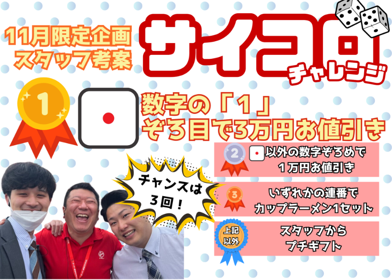 お車のご相談・ 査定だけでもOK! カンタン 入力 30秒 アップルがブランド買取始めました! お電話でも受付中! 受付時間09:30~18:30 011-676-4501 お車のご相談・ 査定だけでもOK! カンタン 入力 30秒 アップルがブランド買取始めました! お電話でも受付中! 受付時間09:30~18:30 011-676-4501 アップルがブランド買取始めました! お電話でも受付中! 受付時間09:30~18:30 011-676-4501 店舗情報 在庫車 スタッフ紹介 ブログ お客様の声 キャンペーン 無料査定 click [ つぶやき ] 2023/11/04 (土) 12:26 3連休いかがお過ごしですか~( *´艸`) みなさまこんにちわ~(^^♪タバタでございますよ~♡本日も楽しく仲良く営業しております!!(^^)/イチョウ並木がきれいなお店の前の道路…彩豊な落ち葉がお店の前に流れ込んできます~♪子供のころ、この落ち葉を山のように集めて焼き芋を焼く、といったマンガに描いていたヒトコマ…いまだに憧れております(笑)さすがに怒られるのでグっとこらえていますwさてさて!お店には日々新しいお車が続々と入庫しております!!今月限定のご成約イベントサイコロチャレンジではまだ1等は出ておりませんよ~( *´艸`)皆様のチャレンジお待ちしております~☆3連休皆様にお会いできることを楽しみにしております(^^♪それではまた~♡ 2023-11-04 12:26:15 新しい記事へ 古い記事へ 最新記事 ジムニーシエラご納車!!ノートご納車!☆ご納車☆在庫車紹介!祝 ご納車!! 店舗情報に戻る 月別アーカイブ 2026年04月(18)2026年03月(24)2026年02月(20)2026年01月(20)2025年12月(22)2025年11月(22)2025年10月(21)2025年09月(23)2025年08月(23)2025年07月(30)2025年06月(23)2025年05月(25)2025年04月(8)2025年03月(16)2025年02月(12)2025年01月(22)2024年12月(21)2024年11月(19)2024年10月(25)2024年09月(24)2024年08月(22)2024年07月(24)2024年06月(24)2024年05月(22)2024年04月(23)2024年03月(25)2024年02月(24)2024年01月(23)2023年12月(22)2023年11月(24)2023年10月(24)2023年09月(26)2023年08月(21)2023年07月(25)2023年06月(24)2023年05月(24)2023年04月(24)2023年03月(25)2023年02月(23)2023年01月(24)2022年12月(22)2022年11月(24)2022年10月(26)2022年09月(24)2022年08月(24)2022年07月(29)2022年06月(27)2022年05月(26)2022年04月(24)2022年03月(24)2022年02月(22)2022年01月(25)2021年12月(22)2021年11月(24)2021年10月(27)2021年09月(25)2021年08月(20)2021年07月(26)2021年06月(31)2021年05月(28)2021年04月(30)2021年03月(31)2021年02月(27)2021年01月(28)2020年12月(27)2020年11月(28)2020年10月(30)2020年09月(28)2020年08月(26)2020年07月(30)2020年06月(30)2020年05月(28)2020年04月(7)2020年03月(3)2020年02月(3)2020年01月(3)2019年12月(6)2019年11月(8)2019年09月(1)