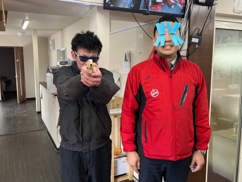 今日は整備士の深田さんが、武装して事務所に乗り込んできました!