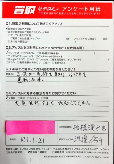 Q:あなたと愛車との思いでをお聞かせください! A:子供が免許を取り、初めて運転した事。 Q4:アップルに対する感想を是非お聞かせください! A: 大満足! 大変気持ちよく対応してくれた。