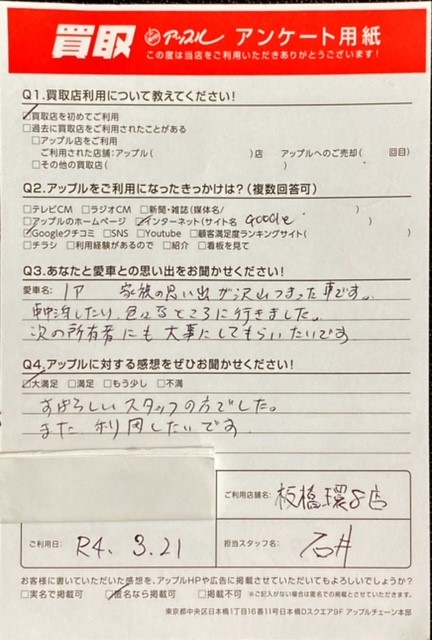 お車のご相談・ 査定だけでもOK! カンタン 入力 30秒 アップルがブランド買取始めました! お電話でも受付中! 受付時間10:00~19:00 0120-234-832 お車のご相談・ 査定だけでもOK! カンタン 入力 30秒 アップルがブランド買取始めました! お電話でも受付中! 受付時間10:00~19:00 0120-234-832 アップルがブランド買取始めました! お電話でも受付中! 受付時間10:00~19:00 0120-234-832 店舗情報 在庫車 スタッフ紹介 ブログ お客様の声 キャンペーン お得 無料査定 click お客様の声 ご記入日: 2022/03/21 東京都北区 S・T様 車名:トヨタ ノア お車:トヨタ ノアQ.愛車との思い出は? A.家族の思い出が沢山つまった車です。車中泊したり色々なところに行きました。次の所有者にも大事にしてもらいたいです。Q.アップルの感想は? A.大満足:すばらしいスタッフの方でした。また利用したいです。 前へ 次へ お客様の声一覧を見る