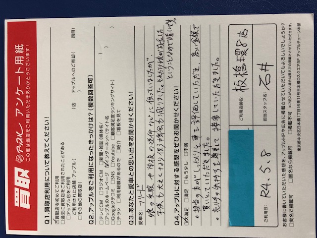 お車:フリード Q:愛車との思い出は? A:娘の受験や学校の送迎等に使っていましたが、子供も大きくなり使う機会も減りました。それだけ娘が成長した事なので嬉しいです。 Q:アップルに感想は? A:担当の方がしっかりと車を評価して頂き、高い金額で買い取って頂きました。売り手の気持ちを尊重して接客して頂きました。