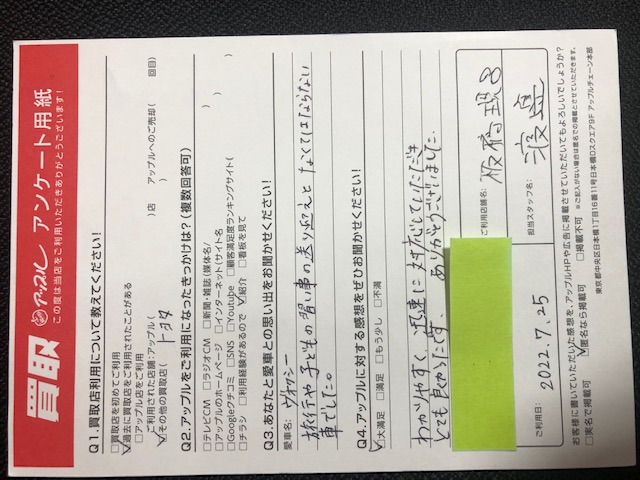 お車のご相談・ 査定だけでもOK! カンタン 入力 30秒 アップルがブランド買取始めました! お電話でも受付中! 受付時間10:00~19:00 0120-234-832 お車のご相談・ 査定だけでもOK! カンタン 入力 30秒 アップルがブランド買取始めました! お電話でも受付中! 受付時間10:00~19:00 0120-234-832 アップルがブランド買取始めました! お電話でも受付中! 受付時間10:00~19:00 0120-234-832 店舗情報 在庫車 スタッフ紹介 ブログ お客様の声 キャンペーン お得 無料査定 click お客様の声 ご記入日: 2022/08/25 大阪府吹田市 T・J様 車名:トヨタ ヴォクシー お車:ヴォクシーQ.愛車との思い出は? A.旅行や子どもの習い事の送り迎えとなくてはならない車でした。Q.アップルの感想は? A.大満足:わかりやすく 迅速に対応していただきとても良かったです。ありがとうございました。 前へ 次へ お客様の声一覧を見る