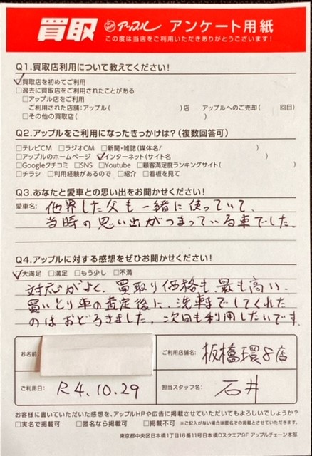 Q.アップルの感想は? A.大満足:対応が良く、買取り価格も 最も高い。買いとり車の査定後に洗車までしてくれたのはおどろきました。次回も利用したいです。