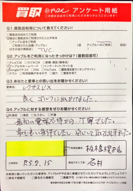 お車のご相談・ 査定だけでもOK! カンタン 入力 30秒 アップルがブランド買取始めました! お電話でも受付中! 受付時間10:00~19:00 0120-234-832 お車のご相談・ 査定だけでもOK! カンタン 入力 30秒 アップルがブランド買取始めました! お電話でも受付中! 受付時間10:00~19:00 0120-234-832 アップルがブランド買取始めました! お電話でも受付中! 受付時間10:00~19:00 0120-234-832 店舗情報 在庫車 スタッフ紹介 ブログ お客様の声 キャンペーン お得 無料査定 click お客様の声 ご記入日: 2023/02/15 O様 車名:レクサス UX Q:あなたと愛車の思い出は? A:良くゴルフに出掛けました。Q:アップルに対する感想は? A:最初の電話対応から、丁寧でした。最も良い条件でしたし、安心して取引出来ました。 前へ 次へ お客様の声一覧を見る