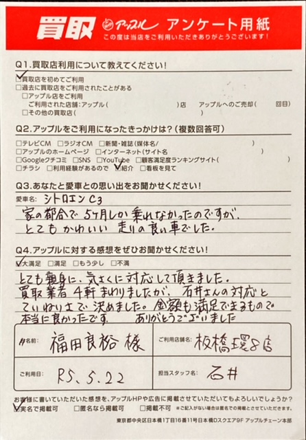 埼玉県川口市 福田 良裕様 車名:シトロエン C3