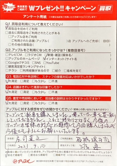 お車のご相談・ 査定だけでもOK! カンタン 入力 30秒 アップルがブランド買取始めました! お電話でも受付中! 受付時間10:00~19:00 0120-234-832 お車のご相談・ 査定だけでもOK! カンタン 入力 30秒 アップルがブランド買取始めました! お電話でも受付中! 受付時間10:00~19:00 0120-234-832 アップルがブランド買取始めました! お電話でも受付中! 受付時間10:00~19:00 0120-234-832 店舗情報 在庫車 スタッフ紹介 ブログ お客様の声 キャンペーン お得 無料査定 click お客様の声 ご記入日: 2023/09/10 東京都板橋区 庄司 直之様 車名:ダイハツ タント Q.アップルの感想は? A.アップルで新車を購入しました。乗っていた車を買取していただきました。これで終わりではなく、今後のアップルの皆様の対応に期待して今回購入しましたので今後ともよろしくお願いたします。 前へ 次へ お客様の声一覧を見る