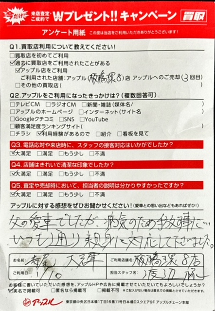 お車:アウディQ3 Q.愛車との思い出は? A.父の愛車でしたが、病気にため手放すことに、、、 いつも通り親身に対応してくださいました。