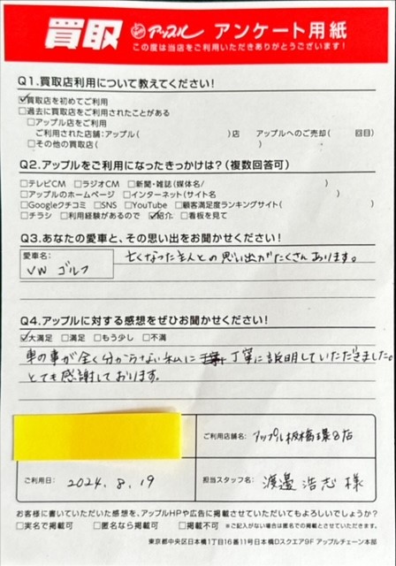 東京都江東区 匿名希望様  車名:フォルクスワーゲン ゴルフ