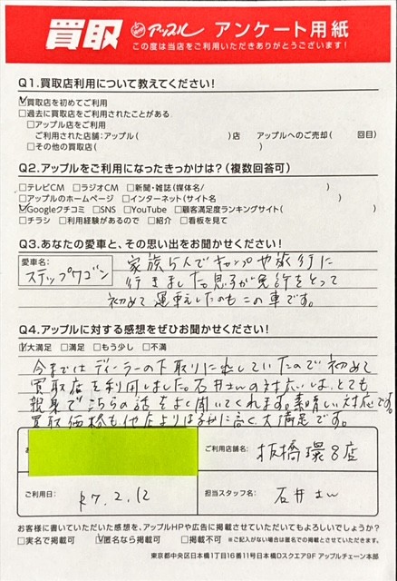 今まではディーラーの下取りに出していたので初めて買取店を利用しました。石井さんの対応はとても親身でこちらの話をよく聞いてくれます。素晴らしい対応です。買取価格も他店よりはるかに高く大満足です。