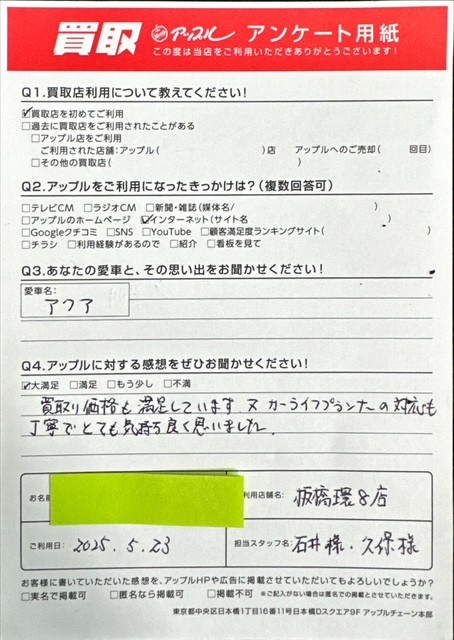 買取価格も満足しています 又カーライフプランナーの対応も丁寧でとても気持ち良く思いました。